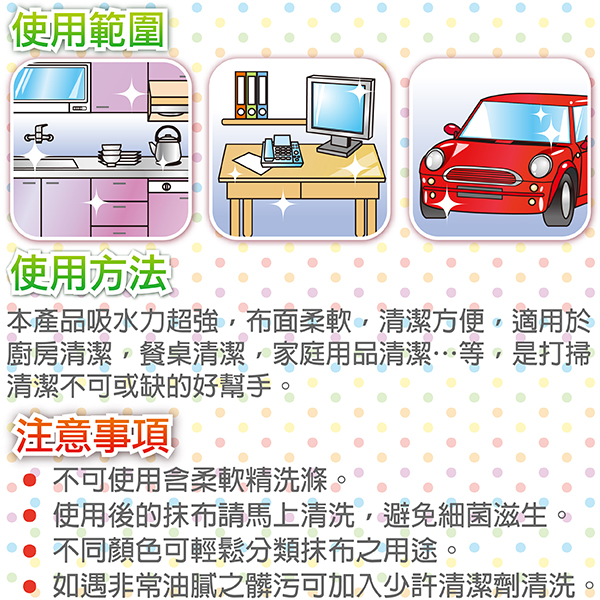 ●可乾濕兩用,除塵力強,不掉毛屑不傷表面,吸水性強。