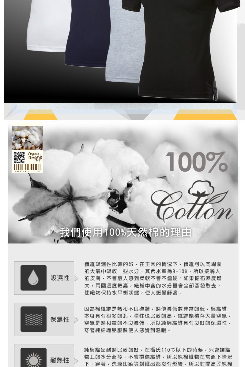 *採用中磅數天然棉+彈性纖維合身型+合身袖口