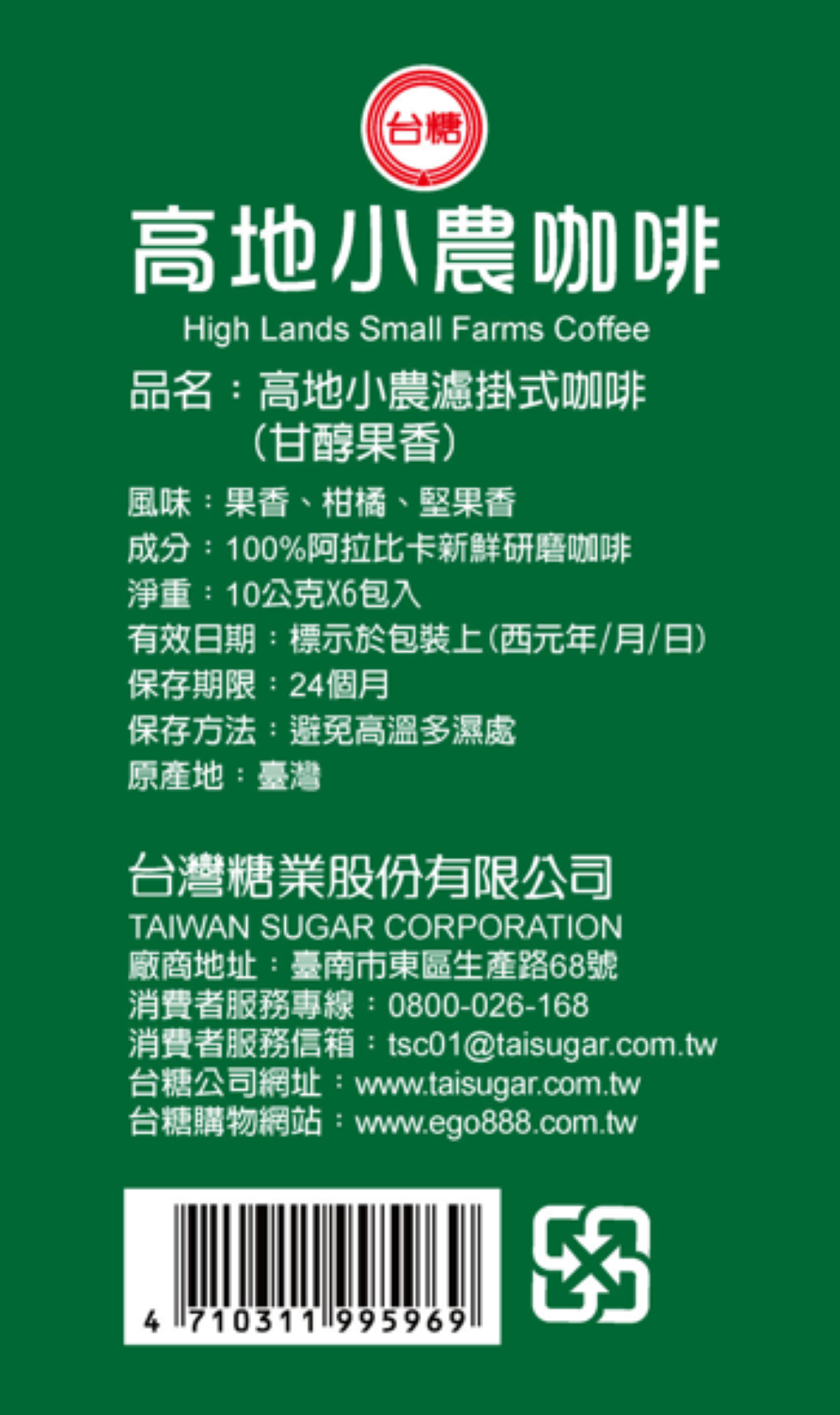 ◆當地小農採不砍樹、不使用化學肥料及殺蟲劑、利用咖啡殘渣製施肥之耕作方式種植咖啡樹,台糖公司直接向當地小農採購高品質咖啡豆,經國內烘焙名師監製烘焙,口感樸實、帶著細膩的酸甜及果香、餘韻回甘香醇。