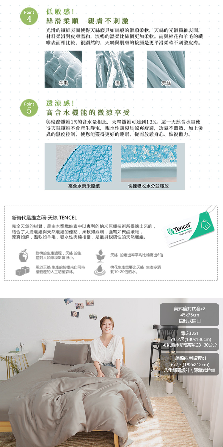 ◇尺寸:雙人加大薄床包-6×6.2尺(180×186公分)±3%/可包覆床墊厚度:約28公分±3%;雙人兩用被-6×7尺(182×212公分)±3%;美式信封枕套-45×72公分±3%