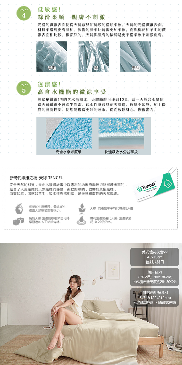 ◇尺寸:雙人加大薄床包-6×6.2尺(180×186公分)±3%/可包覆床墊厚度:約28公分±3%;雙人兩用被-6×7尺(182×212公分)±3%;美式信封枕套-45×72公分±3%