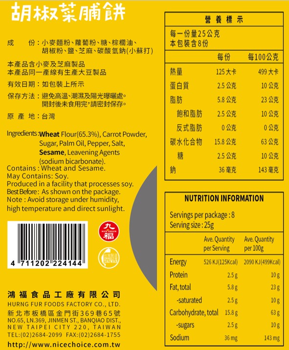 內容物名稱(成分):小麥麵粉、蘿蔔粉、棕櫚油、糖、胡椒粉、鹽、芝麻