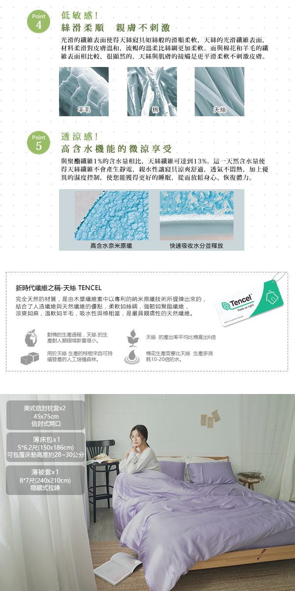 ◇尺寸:雙人薄床包-5×6.2尺(150×186公分)±3%/可包覆床墊厚度:約28公分±3%;雙人特大薄被套-8×7尺(240×210公分)±3%;美式信封枕套-45×72公分±3%