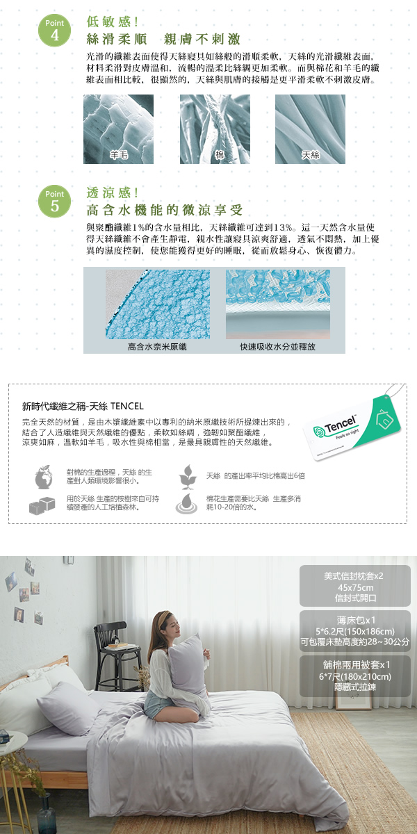 ◇尺寸:雙人薄床包-5×6.2尺(150×186公分)±3%/可包覆床墊厚度:約28公分±3%;雙人兩用被-6×7尺(182×212公分)±3%;美式信封枕套-45×72公分±3%