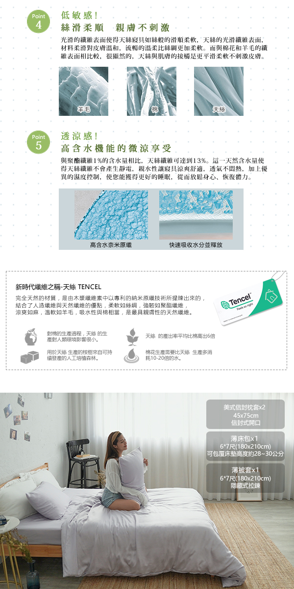 ◇尺寸:雙人特大薄床包-6×7尺(180×210公分)±3%/可包覆床墊厚度:約28公分±3%;雙人薄被套-6×7尺(180×210公分)±3%;美式信封枕套-45×72公分±3%