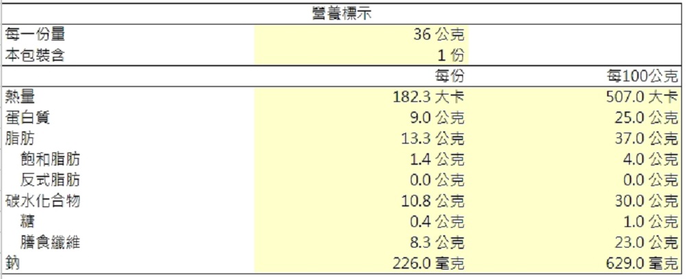 | 營養標示||每一份量 36公克|每份 每100公克|
