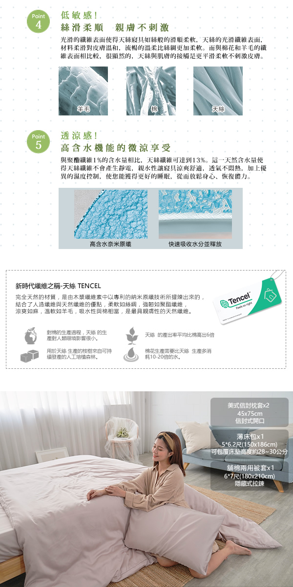 ◇尺寸:雙人薄床包-5×6.2尺(150×186公分)±3%/可包覆床墊厚度:約28公分±3%;雙人兩用被-6×7尺(182×212公分)±3%;美式信封枕套-45×72公分±3%