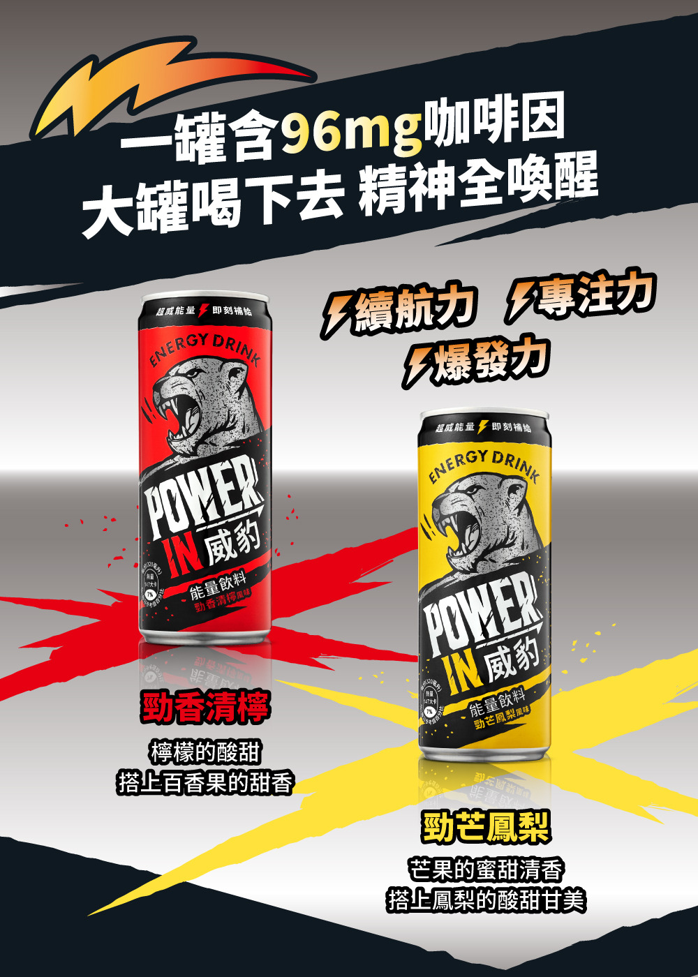來一罐Power in 讓你能量即刻in! • 超威能量、迅速補給 • 一罐含96mg咖啡因 • 大罐(320ml)喝下去、精神全喚醒 • 雙重水果風味清爽酸甜,順口好喝