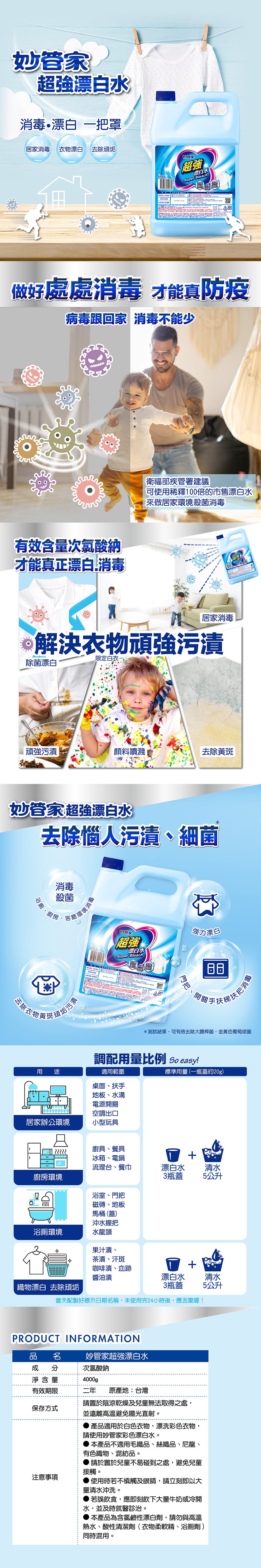 適用於:織物漂白,去除頑垢,居家辦公環境清潔,浴厠消毒,廚房環境