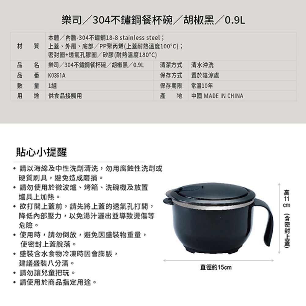 商品尺寸:約直徑15x高11cm(含密封上蓋)/0.9L 商品材質 :本體/內膽-304不鏽鋼18-8 stainless steel;上蓋、外層、底部/PP聚丙烯(上蓋耐熱溫度100°C);密封圈+透氣孔膠圈/矽膠(耐熱溫度180°C) 原產地(國):中國