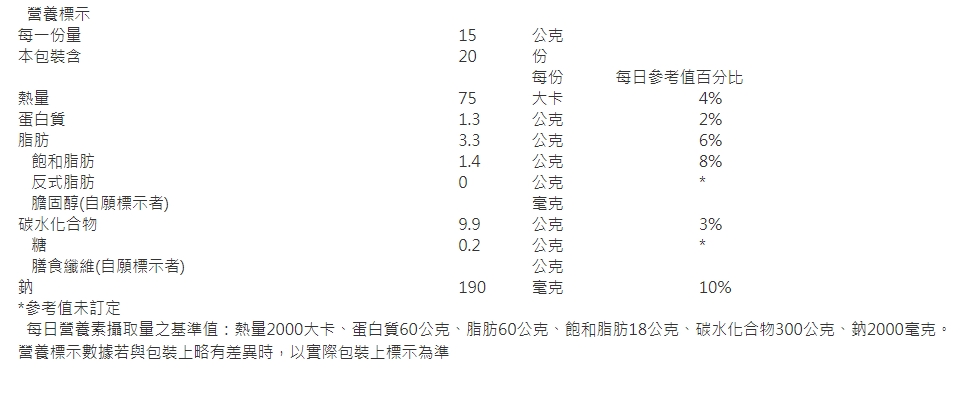 品牌:味王 規格:300g/袋 成分:成分:麵粉、棕櫚油、樹薯澱粉、食鹽、綠海苔、麥芽糊精、芝麻油(含大豆油)、醬油、葡萄糖、昆布芽粉、調味劑(L-麩酸鈉、胺基乙酸、琥珀酸二鈉)、砂糖、黑芝麻粉、蒜粉(含樹薯澱粉)、複方香料粉(含麥芽糊精、二氧化矽)、品質改良劑【碳酸鉀、偏磷酸鈉、多磷酸鈉、磷酸二氫鈉(無水)、焦磷酸鈉(無水)、二氧化矽】、豬肉調味粉(豬肉抽出物、酵母抽出物、五香粉、八角粉、砂糖、二氧化矽、薑粉、5′-鳥嘌呤核苷磷酸二鈉、5′-次黃嘌呤核苷磷酸二鈉)、黑胡椒粉(含地瓜澱粉、辣椒、花椒)、白胡椒粉(含地瓜澱粉、辣椒、花椒)、起司粉(含奶粉、食鹽、磷酸氫二鈉、氯化鈣、食用黃色5號、食用黃色4號、二氧化矽)、薑粉、關華豆膠、香蔥抽出物(紅蔥、玉米澱粉、軟棕油、麥芽糊精)、辣椒粉、碳酸氫鈉、大豆水解蛋白(含油菜籽油)、抗氧化劑〔混合濃縮生育醇(含油菜籽油)〕 營養標示:如圖示 產地:台灣 保存期限:180天 有效期限:因為商品每次進貨不同,因此實際有效期限以包裝上為準,出貨至少距離有效期限30天 食用方法:食用前請先瑤均勻 過敏原資訊:小麥、芝麻、大豆、牛奶 保存方法:避免陽光直射,常溫保存,開封後請儘早食用 食品業者登錄字號:F-107067309-00014-0 國內負責廠商名稱:味王股份有限公司 國內負責廠商電話:0800-221-121 國內負責廠商地址:台北市中山北路二段79號7樓 投保產品責任險字號:5113PDT00376 ◎ 製造日期與有效期限,商品成分皆標示於包裝盒上 ◎ 本產品網頁因拍攝關係,圖檔略有差異,實際以廠商出貨為主 ◎ 本產品文案若有變動敬請參照實際商品為準 ◎ 以消費者收受日算起,至少距有效日期前【30】日以上:依商品包裝標示,若收到小於30天可聯絡客服供退換貨