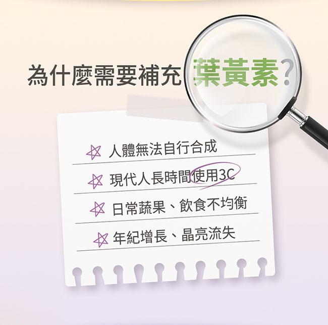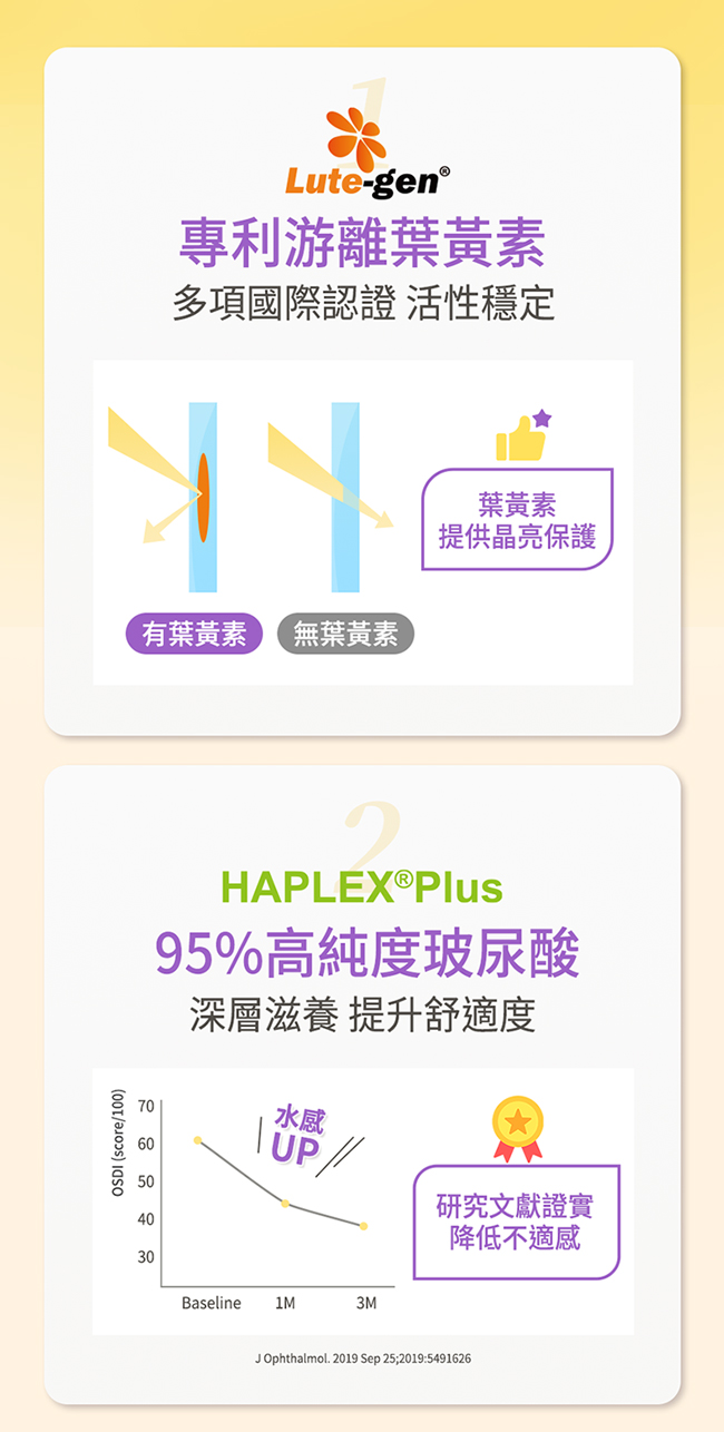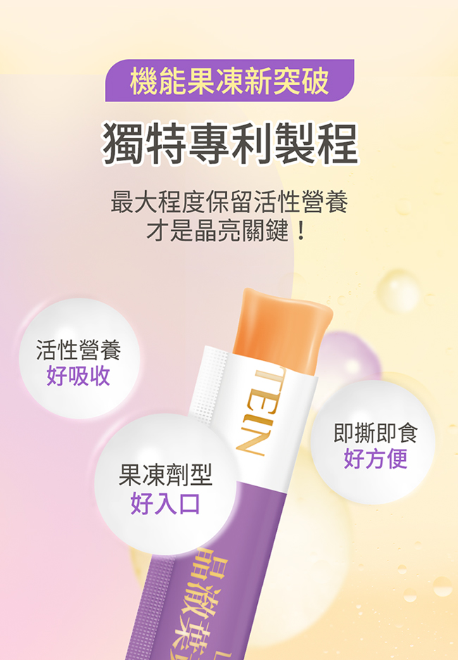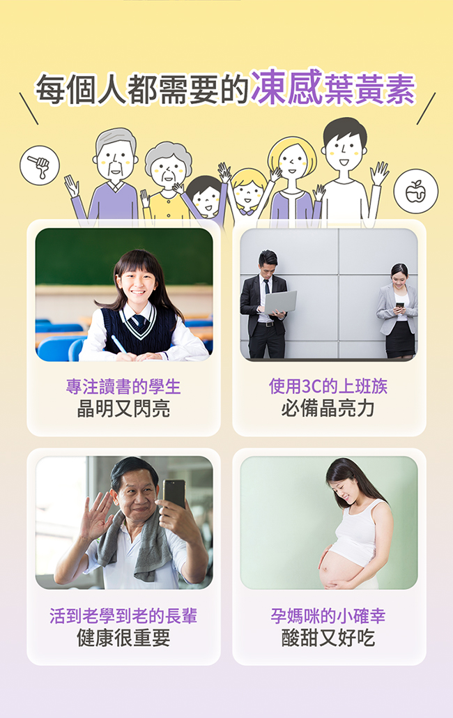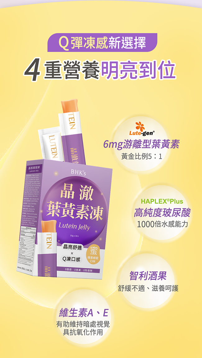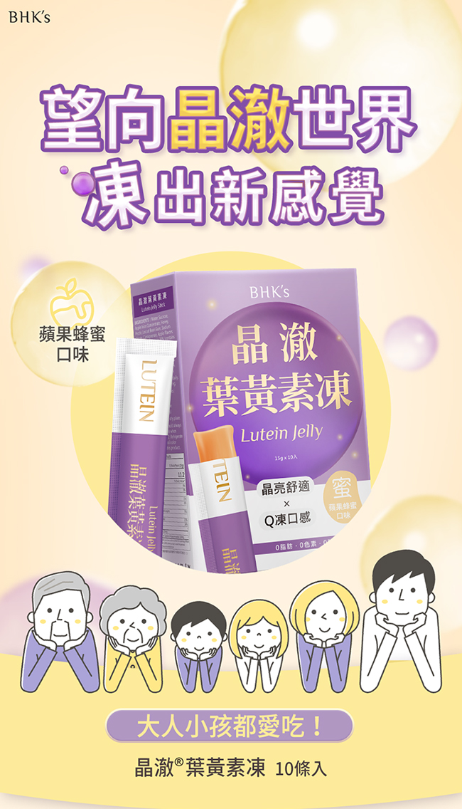 全家大小的舒適晶亮! 游離葉黃素x高純度玻尿酸,晶亮水潤一次滿足 專利果凍製程,最大程度保留活性 蘋果蜂蜜Q彈爽口,大人小孩都愛吃