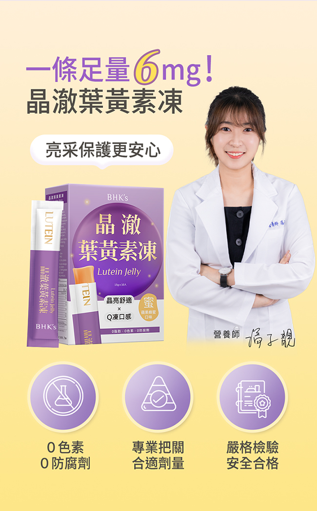 商品名稱: BHK's 晶澈葉黃素凍 (10包/盒) 主成分:水、蔗糖、蘋果濃縮汁、蜂蜜、蘋果果膠(果膠、蔗糖)、刺槐豆膠、檸檬酸鈉、鹿角菜膠(鹿角菜膠、葡萄糖)、蘋果香料、蒟蒻粉、葉黃素20%(含玉米黃素4%)(阿拉伯膠、葉黃素、維生素E(抗氧化劑))、檸檬酸、氯化鉀、蜂蜜香料(香料、維生素E(抗氧化劑))、流行鏈球菌發酵物(含玻尿酸)、智利酒果粉、DL-蘋果酸、維生素E(維生素E、麥芽糊精、辛烯基丁二酸鈉澱粉、二氧化矽)、玉米糖膠、維生素A(乾燥葡萄糖漿、阿拉伯膠、玉米澱粉、維生素A醋酸鹽、維生素E(抗氧化劑))、蔗糖素(甜味劑)、塔拉膠、結蘭膠。 內容量:15克 x 10入 食用方法: 每日1包,請細嚼慢嚥,以免噎到。 保存期限: 二年。 有效日期: 如外包裝標示(西元年/月/日) 原產地:台灣 保存方式: 避免日光直射、高溫、潮濕,開封後盡快食用完畢。 注意事項: 1. 兒童食用時,請家長陪同。 2. 冷藏後食用,風味更佳。 3. 成分來源天然,色澤略有深淺不同屬自然現象,請安心食用。 廠商名稱:帝力股份有限公司 廠商電話:02-2545-8140 廠商地址:台北市中山區南京東路3段189號8樓 食品業者登錄字號:A-154325862-00000-3