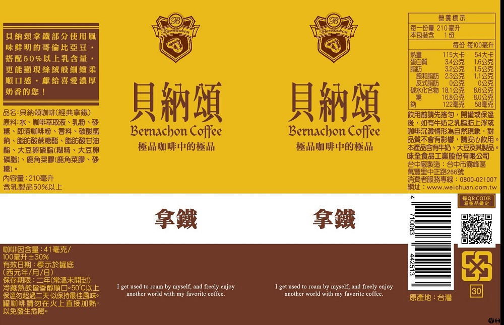 成分:水、咖啡萃取物、乳粉、砂糖、奶精(葡萄糖漿、氫化棕櫚仁油、乾酪素鈉、檸檬酸鈉、磷酸氫二鉀、脂肪酸甘油酯、二氧化矽、食鹽、香料、單及雙脂肪酸甘油二乙醯酒石酸酯)、複方香料(香料、乙醇)、乳化劑(脂肪酸蔗糖酯、琥珀酸甘油酯)、檸檬酸鈉、碳酸氫鈉、鹿角菜膠(含砂糖)、卵磷脂(含糊精)
