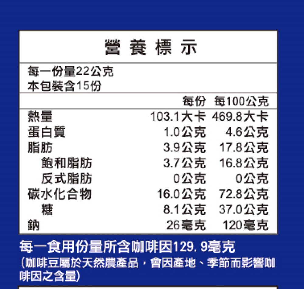 - 成分:奶精(葡萄糖漿、完全氫化棕櫚仁油、檸檬酸鉀、乾酪素鈉、脂肪酸甘油酯、二氧化矽)、砂糖、即溶咖啡粉、冷凍乾燥咖啡粉、乳糖、可可粉、二氧化矽、香料、碳酸氫鈉、鹽