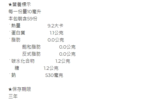 - 成分:水、非基因改造脫脂大豆片、小麥、食鹽、砂糖、調味劑(L-麩酸鈉、DL-胺基丙酸、琥珀酸二鈉、5’-次黃嘌呤核苷磷酸二鈉)、食用酒精、複方調味劑[甜味劑(D-山梨醇液70%)、水、丙二醇、食用酒精、胺基乙酸、氯化鈉、琥珀酸二鈉、乙基麥芽醇、多磷酸鈉]、品質改良劑(偏磷酸鈉、多磷酸鈉)、複方甜味劑(糊精、檸檬酸鈉、甘草萃)