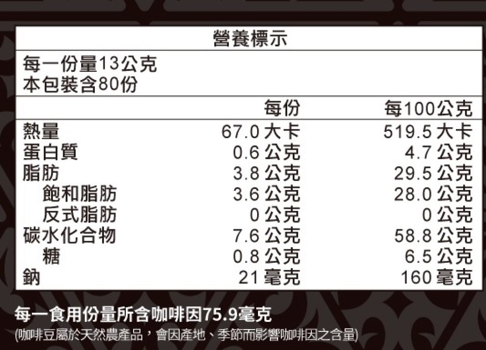 - 品牌:廣吉 - 規格:1040g - 成分:奶精(葡萄糖漿、完全氫化棕櫚仁油、檸檬酸鉀、乾酪素鈉、脂肪酸甘油酯、二氧化矽、婀娜多色素)、咖啡粉、可可粉、鹽 - 營養標示:如圖示 - 產地:台灣 - 保存期限:2年 - 有效期限:因為商品每次進貨不同,因此實際有效期限以包裝上為準,出貨至少距離有效期限30天 - 食用方法:1包沖泡120c.c-140c.c熱水/冷水攪拌均勻 - 過敏原資訊:本產品含牛奶及其製品。 生產線也生產含有麩質之穀物、花生、芝麻、大豆、堅果類、甲殼類、魚類及其製品之產品。 - 保存方法:請置於陰涼乾燥處,開封後請儘速食用 - 食品業者登錄字號:F-186278150-00000-0 - 國內負責廠商名稱:廣吉食品股份有限公司 - 國內負責廠商電話:0800-600-117 - 國內負責廠商地址:新北市新莊區五權二路22號6樓之9 - 產品責任險:80-109-08224254-00006-PDL◎ 製造日期與有效期限,商品成分皆標示於包裝盒上 ◎ 本產品網頁因拍攝關係,圖檔略有差異,實際以廠商出貨為主 ◎ 本產品文案若有變動敬請參照實際商品為準