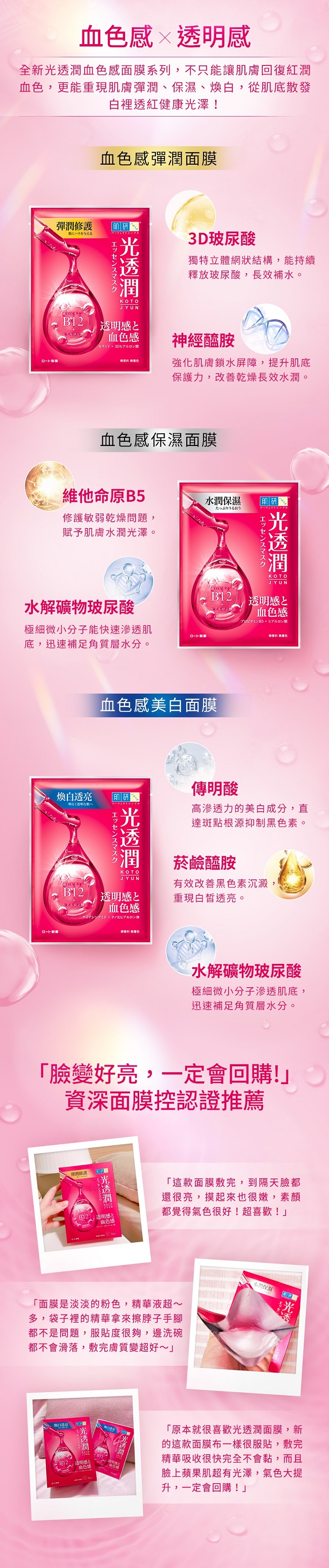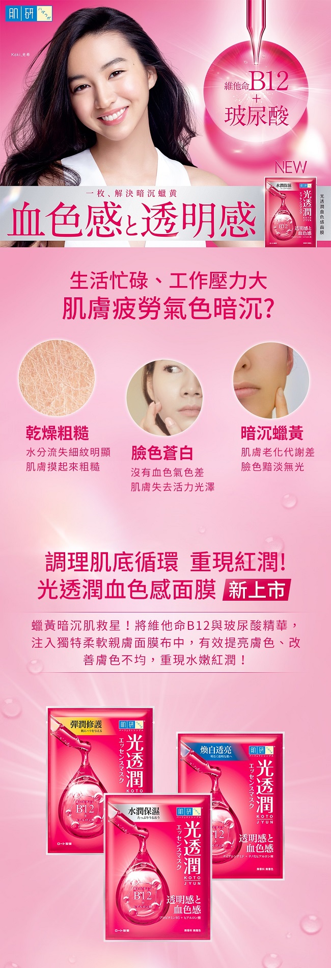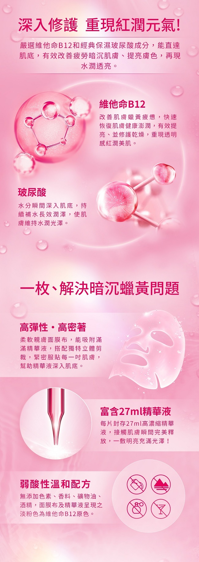 血色感面膜誕生! 添加維他命B12,能有效促進肌膚循環,改善暗沉蠟黃。同時添加維他命B5和雙重玻尿酸,迅速深入角質層補水,賦予肌膚水潤光澤,再現水嫩紅潤感。