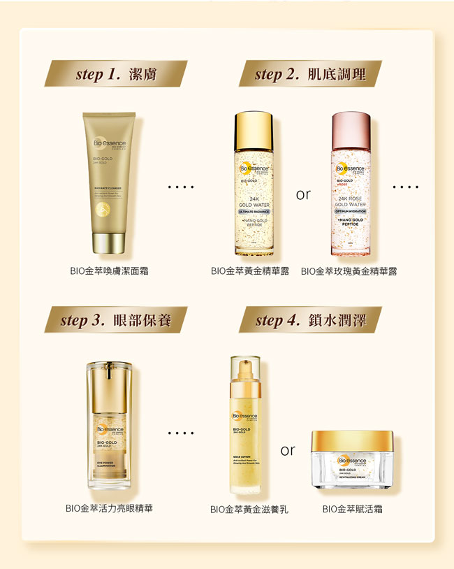 24K BIO黃金,古代皇室貴族用來維持年輕美貌之聖品。環境侵襲會使肌膚老化,造成暗沉與細紋等肌膚問題,24K BIO黃金為能肌膚提供堅強之保護力,有效對抗環境侵襲、延緩老化,維持肌膚平滑並由內而外剔透柔亮。