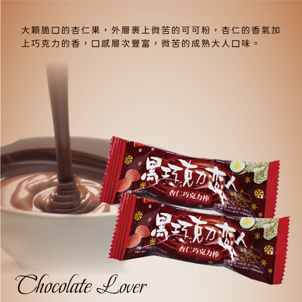 - 成分:杏仁角、代可可脂黑巧克力(砂糖、完全氫化棕櫚仁油、可可粉、乳糖、可可脂、大豆卵磷脂、巧克力香料)、糙米 、棕櫚油、麥芽糊精、白米、玉米、砂糖、蛋粉、醬油粉(大豆、小麥、精鹽、砂糖)