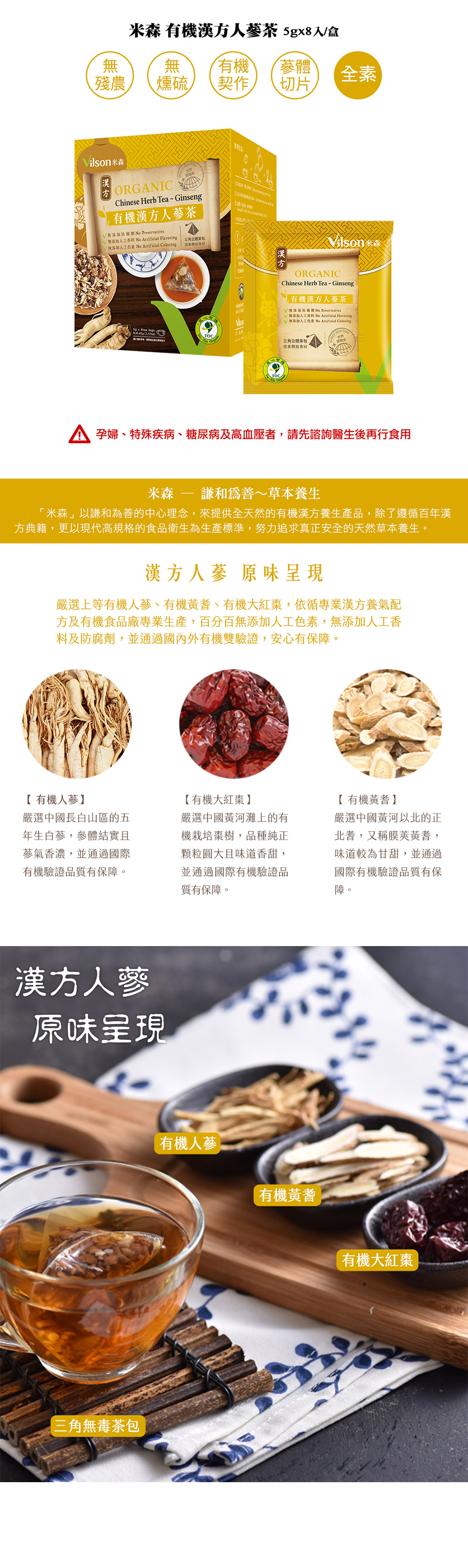 內容物名稱(成分):有機紅棗(中國)、有機黃耆(中國)、有機人參主根(中國)