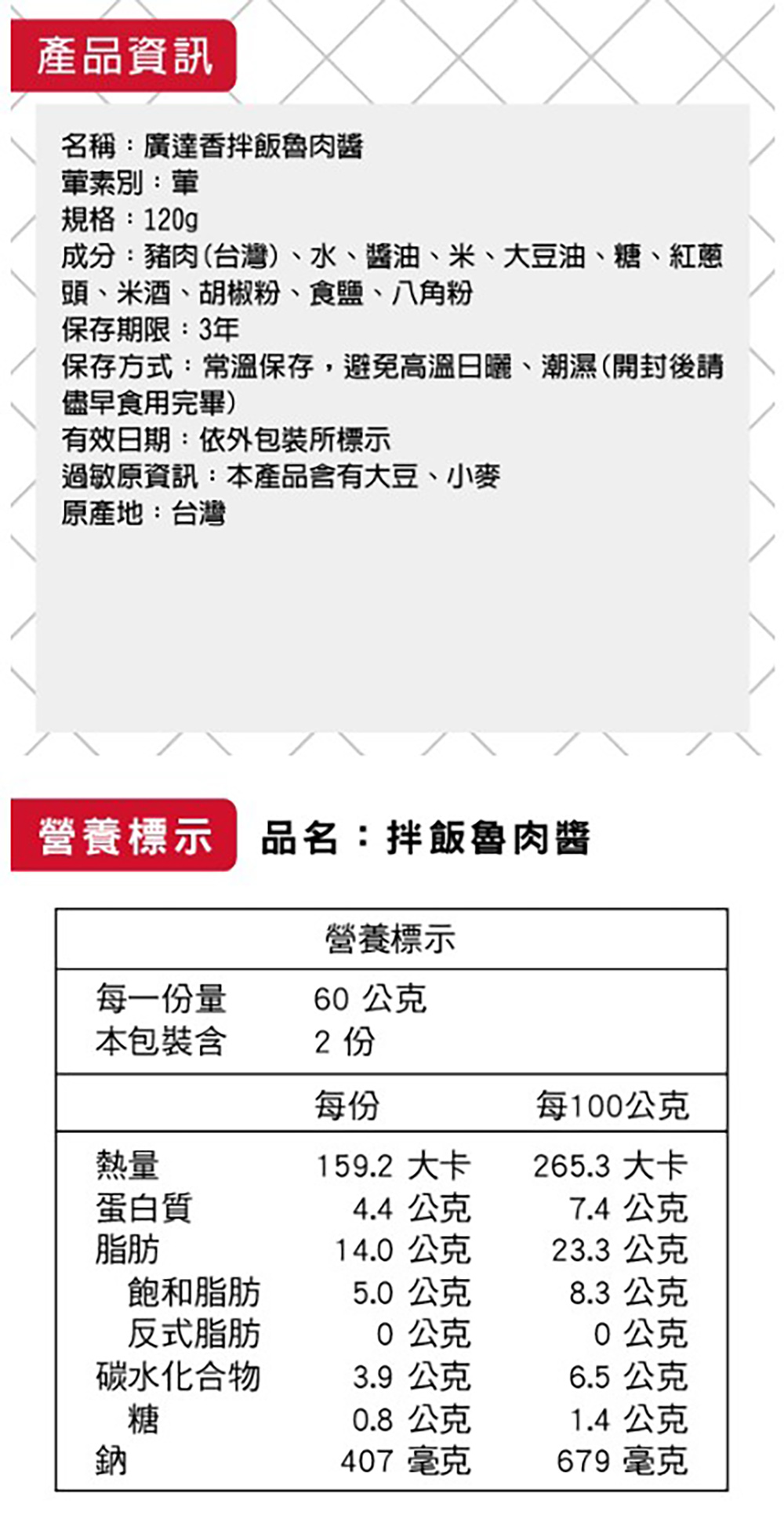成分:豬肉(台灣)、水、醬油、米、大豆油、糖、紅蔥頭、米酒、胡椒粉、食鹽、八角粉