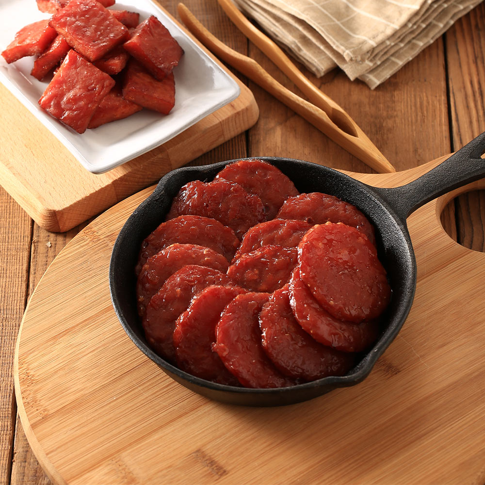 嚴選檢驗合格國產豬後腿肉為原料,加入特調配料醃漬按摩入味,再以高溫烘乾成型,並佐以糖燻製成。外型呈圓形狀,肉質細緻不乾澀,組織中富含油花,口感軟嫩多汁有彈性,讓人無法抗拒,想要一口接一口。