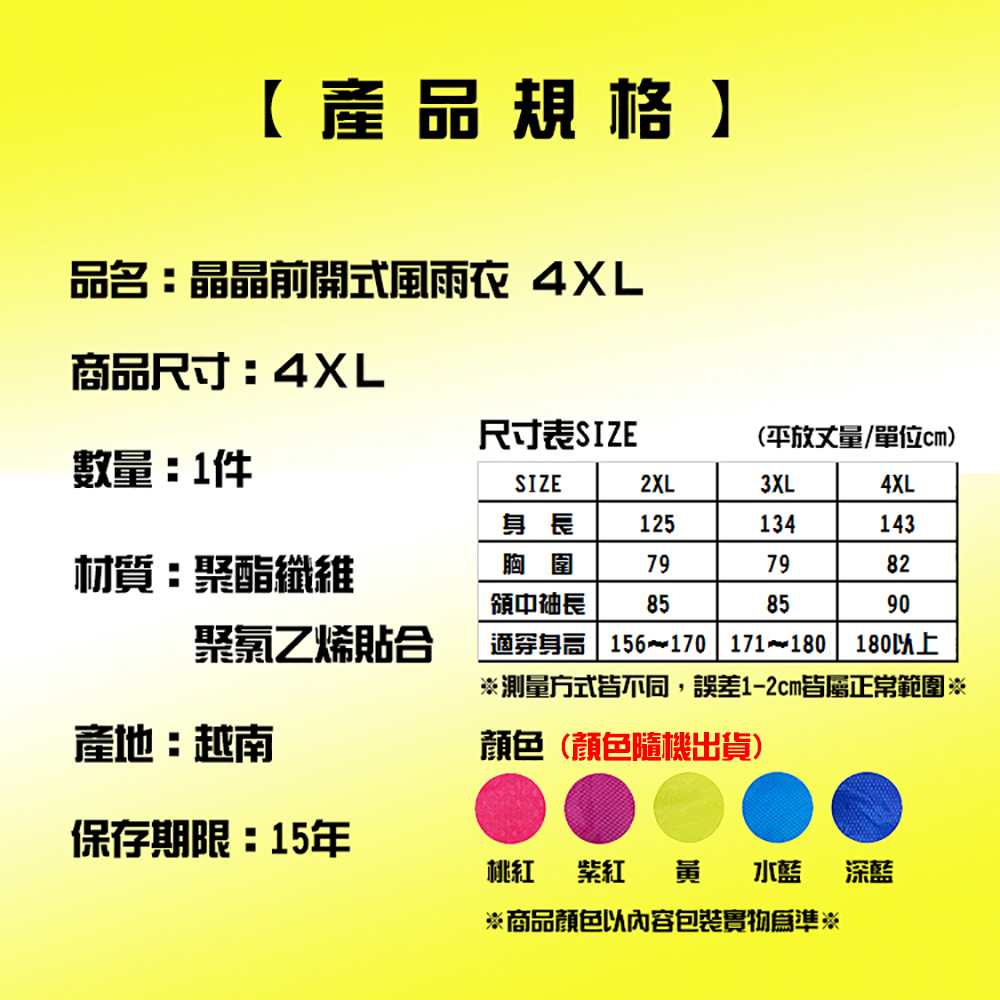 晶寅】晶晶前開式風雨衣 4XL(1件(顏色隨機出貨))