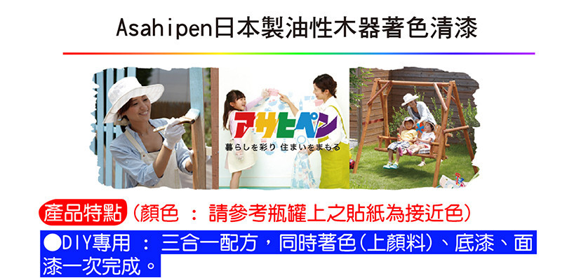 #Asahipen #著色漆 #耐磨漆 #透明漆 #亮光漆 #油漆 #水泥漆 #乳膠漆 #噴漆 #底漆 #批土 #木頭漆 #木器漆 #水性漆 #油性漆 #耐熱漆 #隔熱漆