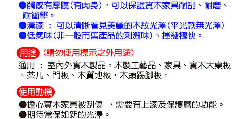 4.使用本劑前如能先購用本公司的"木器著色整平填補劑"(木器著色填補膩子)可防止木脂滲出並使木品表面更為細滑、木紋清晰、深艷、厚實、高質感、節省塗料及節省塗刷數(全刷2次即有塗刷3、4次的深艷厚實感)