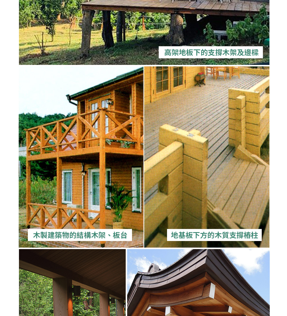 ※本塗劑須使用於未塗漆的結構用木材表面。如表面已經塗漆,應先磨除後才塗本劑。塗完本劑後可以再上透明漆。