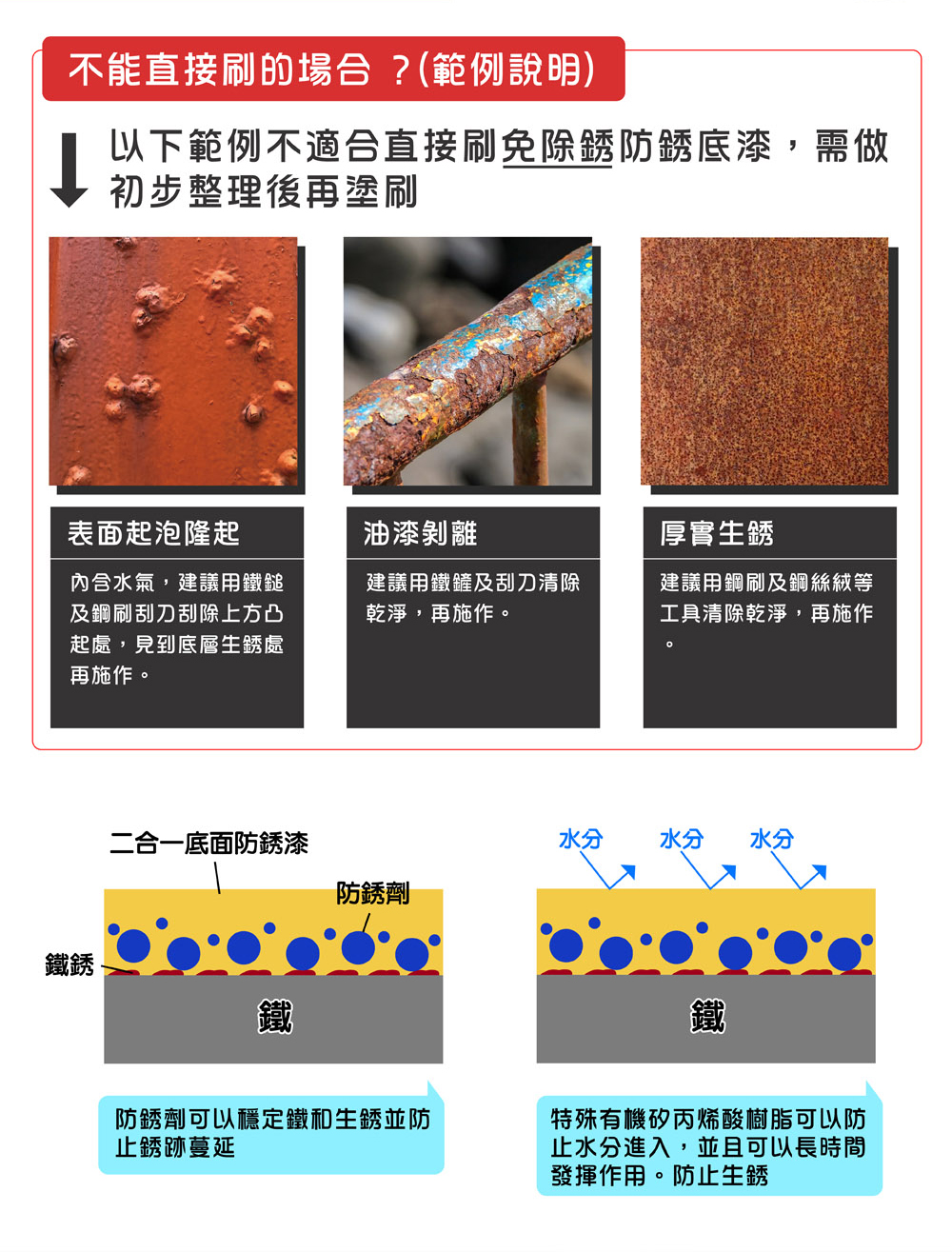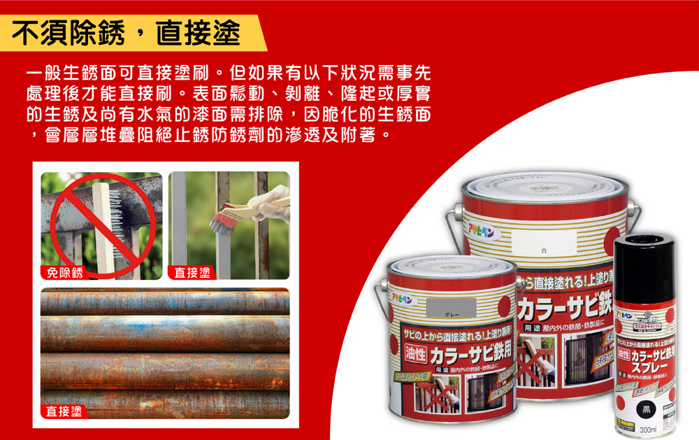 含強力防鏽成分 可達長期防鏽 免除鏽免打底 開啟防鏽新時代 低臭味 不含鉛鉻汞 無毒性
