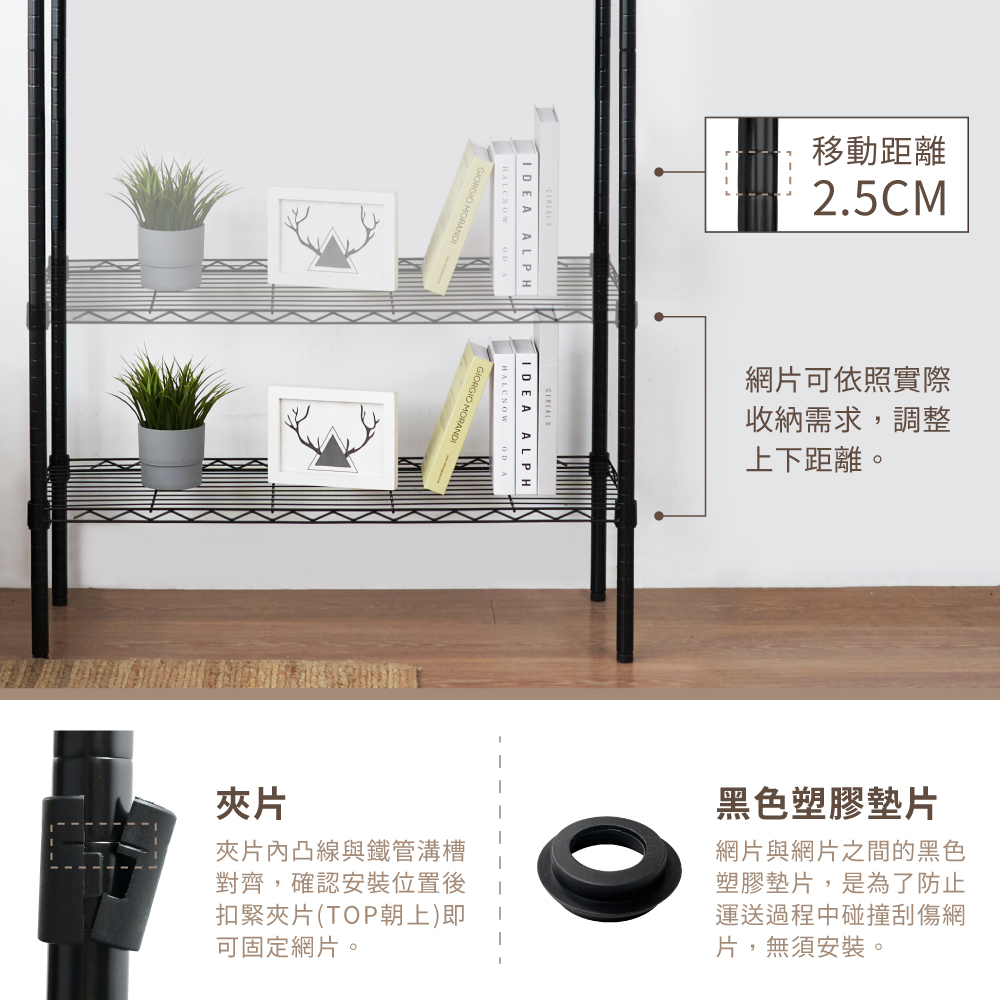 ● 網片採夾片式固定,可依需求自由調整網片高度(間距),有效利用每一個收納空間。