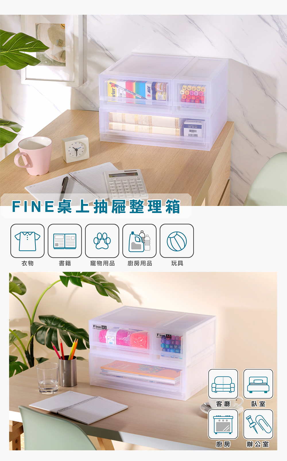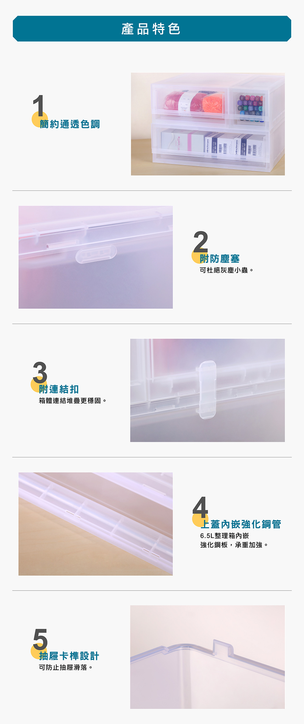 - 使用方法:透明色系,簡約素雅,清楚分類,一覽無遺,適用於文書工具、雜物等放置,其中6.5L之產品(LF3371),內嵌合金鋼管設計,支撐加強,購買不同大小之收納盒,亦可隨需求喜好,自由組合層層堆疊,內附連結扣、防塵塞,使箱與箱之間,緊扣不易脫落,抽屜內卡榫設計,可防止抽屜掉落。