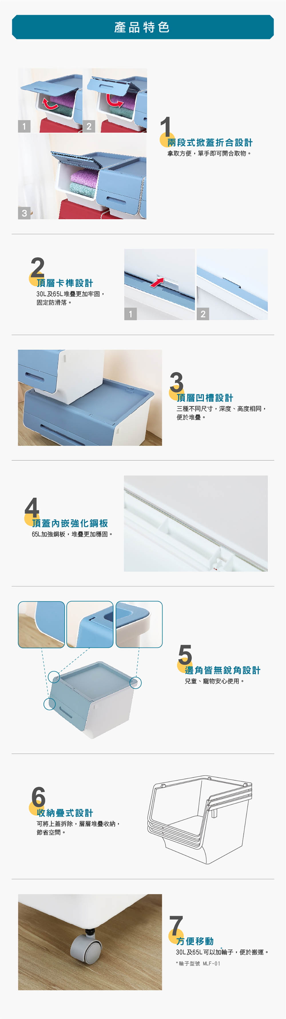 - 使用方法:兩段式掀蓋設計,掀蓋可折合固定,取物更便利,頂層卡榫及凹槽設計,
