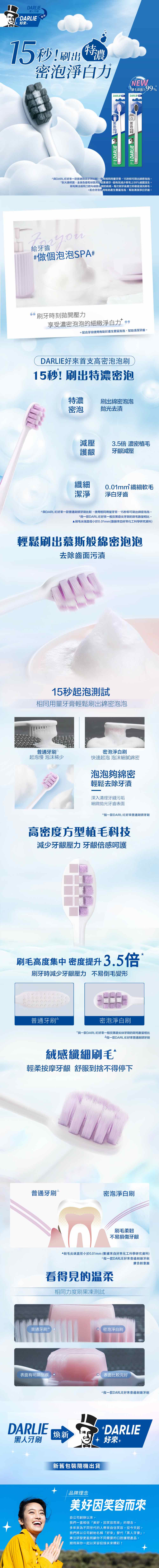 刷出綿密泡泡:高密排列,輕鬆刷出細密泡泡,溫和潔淨。