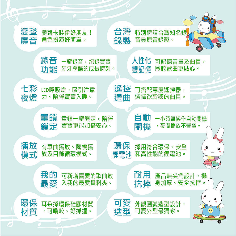 ●功能齊全:錄音、童鎖、夜燈、變聲魔音、隨機播放、單曲循環,附專屬遙控器