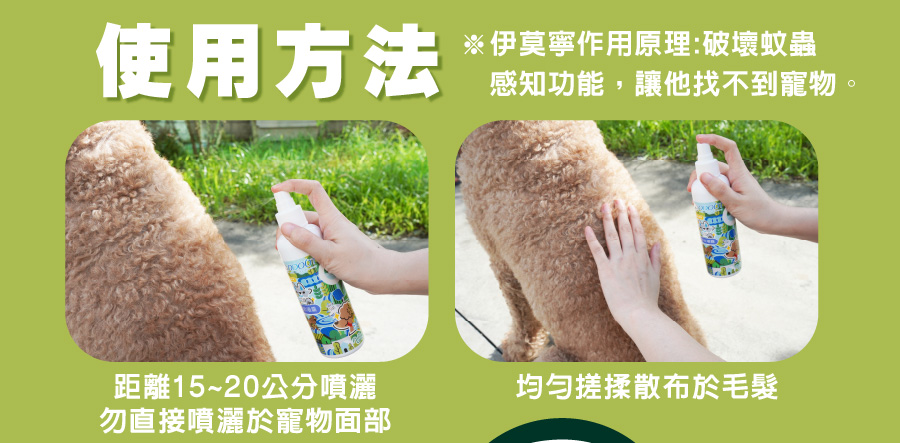 臭味滾防蚊液不含DEET、PMD,配方溫和不刺激;有效驅趕蚊子、小黑蚊,給寵物全方位的防護。 含20%伊莫寧成份,驅蚊效果長達8小時! 伊莫寧取得世界衛生組織(WHO)、美國CDC、FDA、台灣疾管署多國認可,相對安全及有效防蚊成分。 透明無味,清爽無刺激。