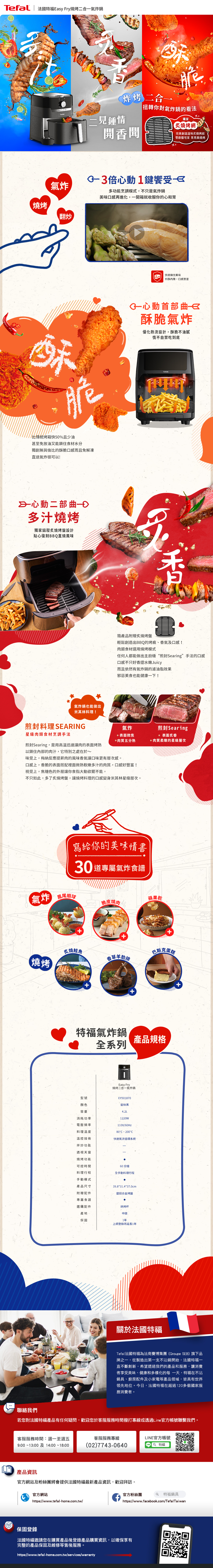 - 品牌:特福 - 型號:EY501870 - 規格:1入 機身:PP 內鍋:PP + 鋁合金 - 保固:1年 - 產地:中國 2種烹飪模式,不僅氣炸還可燒烤 獨家附送炙燒烤盤,宅家零廚藝,也能吃到真正道地、有漂亮烤紋的燒烤 4.2公升大容量,可供四人家庭共享美味料理 溫控範圍為80°C到200°C,可控制時間60分鐘,滿足所有料理需求 行程結束有提醒音效,不用再顧爐火 快速氣流循環系統,優化熱流循環,快速在內鍋內不停對流;只要加一點點油或完全不加油,就可讓料理擁有無比酥脆口感,還能保留食材原有水分 旋鈕控制溫度,再用旋鈕轉動計時旋鈕即啟動,操作直覺簡單,馬上就上手 超容易清潔,沿襲特福不沾塗層特色,不易沾黏;且內鍋以及炙燒烤盤皆可進洗碗機清洗,清潔氣炸鍋終於不再手忙腳亂 不須預熱 (氣炸),料理完畢後即可馬上製作下一道料理。 專屬30道食譜,不只氣炸更有燒烤,氣炸料理再進化!◎ 製造日期與有效期限,商品成分皆標示於包裝盒上 ◎ 本產品網頁因拍攝關係,圖檔略有差異,實際以廠商出貨為主 ◎ 本產品文案若有變動敬請參照實際商品為準