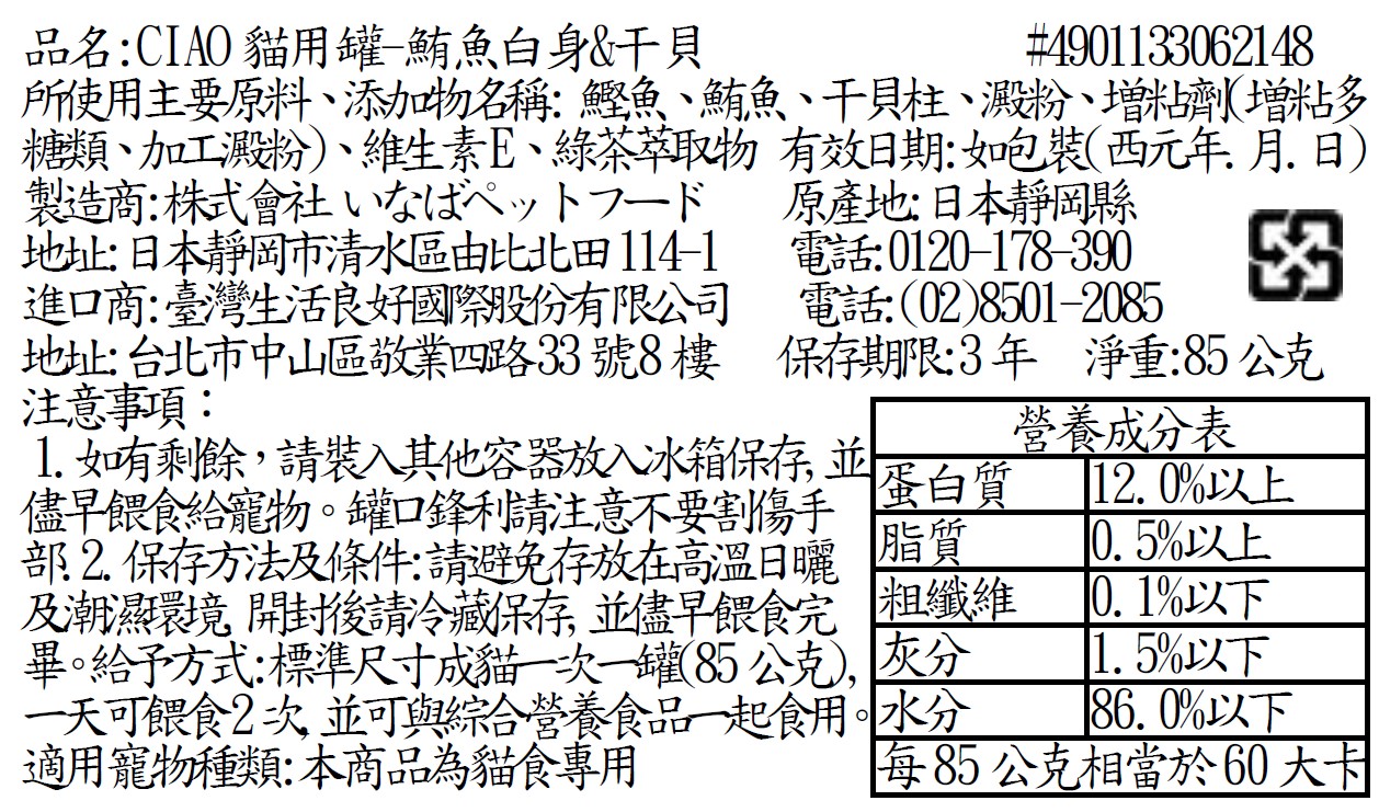 1. 如有剩餘,請裝入其他容器放入冰箱保存並儘早餵食給寵物 。 罐口鋒利請注意不要割傷手部 2. 保存方法及條件請避免存放在高溫日曬及潮濕環境。開封後請冷藏保存並儘早餵食完畢。 給予方式標準尺寸成貓一次一罐 85 公克,一天可餵食 2 次 並可與綜合營養食品一起食用。