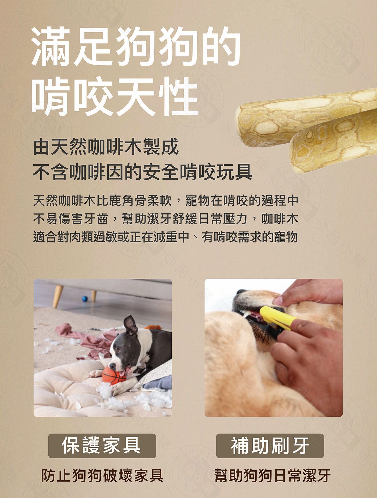 ●注意事項:當寵物在啃咬咖啡木時可能會使細小的 木纖維剝落,這些天然的木纖維是無害 的,會被消化排出體外,啃咬時請飼主 在旁監看,建議啃咬時間10-15分鐘