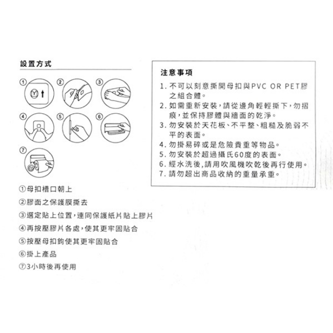 規格:約13.8*15*14.5~16.5cm(膠體尺寸:約68mm*9mm) 承受重量:1.8kg 商品材質:PU膠、聚氯乙烯、PET膠膜、聚丙烯 保存期限:10年 產地:台灣 適用材質:玻璃、磁磚、不銹鋼板、烤漆板、水泥油漆牆、PVC板、壓克力板…等平滑牆面。 注意事項: ◎ 不可以刻意撕開母扣與PVC OR PET膠之組合體。 ◎ 如需重新安裝,請從邊角輕輕撕下,勿摺痕,並保持膠體與牆面的乾淨。 ◎ 勿安裝於天花板、不平整、粗糙及脆弱不平的表面。 ◎ 勿掛易碎、危險或是貴重…等物品。 ◎ 勿安裝於超過攝氏60度的表面。 ◎ 經水洗後,請用吹風機吹乾後再行使用。 ◎ 請勿超出商品收納的重量承重。 ◎ 製造日期與有效期限,商品成分皆標示於包裝盒上 ◎ 本產品網頁因拍攝關係,圖檔略有差異,實際以廠商出貨為主 ◎ 本產品文案若有變動敬請參照實際商品為準