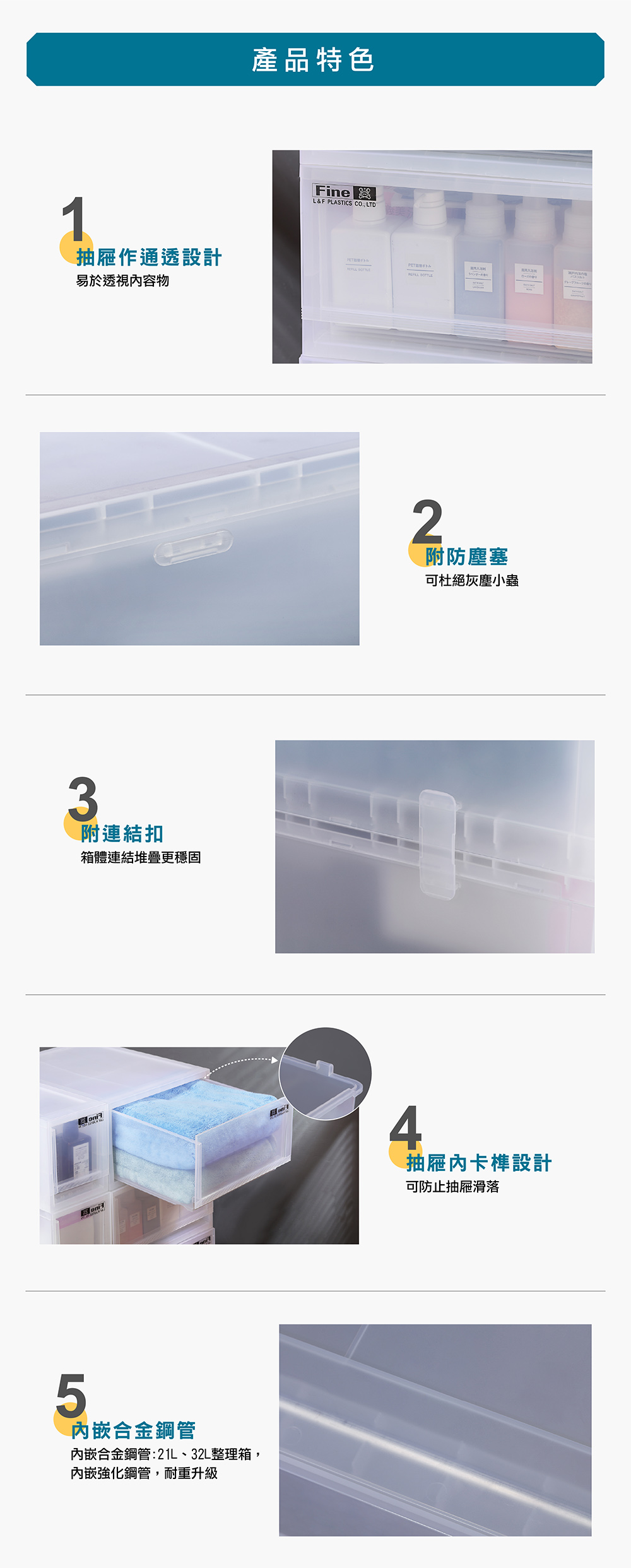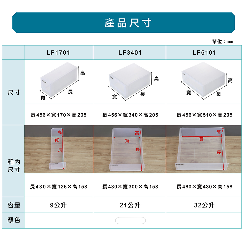 - 使用方法:潔白透明色系,一覽無遺,抽屜式抽拉設計,附防塵塞,適用於各式衣物、玩具、雜物等收納,購買不同尺寸之整理箱,亦可隨自身喜好自由堆疊,節省空間;抽屜內卡榫設計,可防止抽屜掉落,附連結扣,使堆疊組合更穩固,亦可搭配鐵架、系統櫃使用,其中21L(LF3401)、32L(LF5101)之產品內嵌合金鋼管,支撐加強更穩固,可另行購買(MLF01)滑輪組搭配使用。