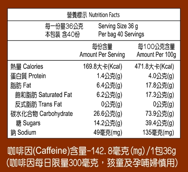 內容物成分:奶精(葡萄糖漿、完全氫化椰子油、脫脂乳粉、乾酪素鈉、無水奶油、磷酸氫二鉀、脂肪酸甘油酯、多磷酸鈉、二氧化矽、單及雙脂肪酸甘油二乙醯酒石酸脂、檸檬酸鉀、天然香料、β-胡蘿蔔素)、砂糖、即溶咖啡。 *本產品含牛奶成份