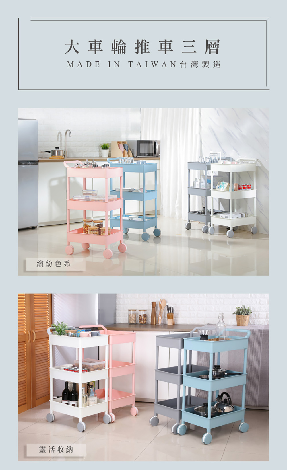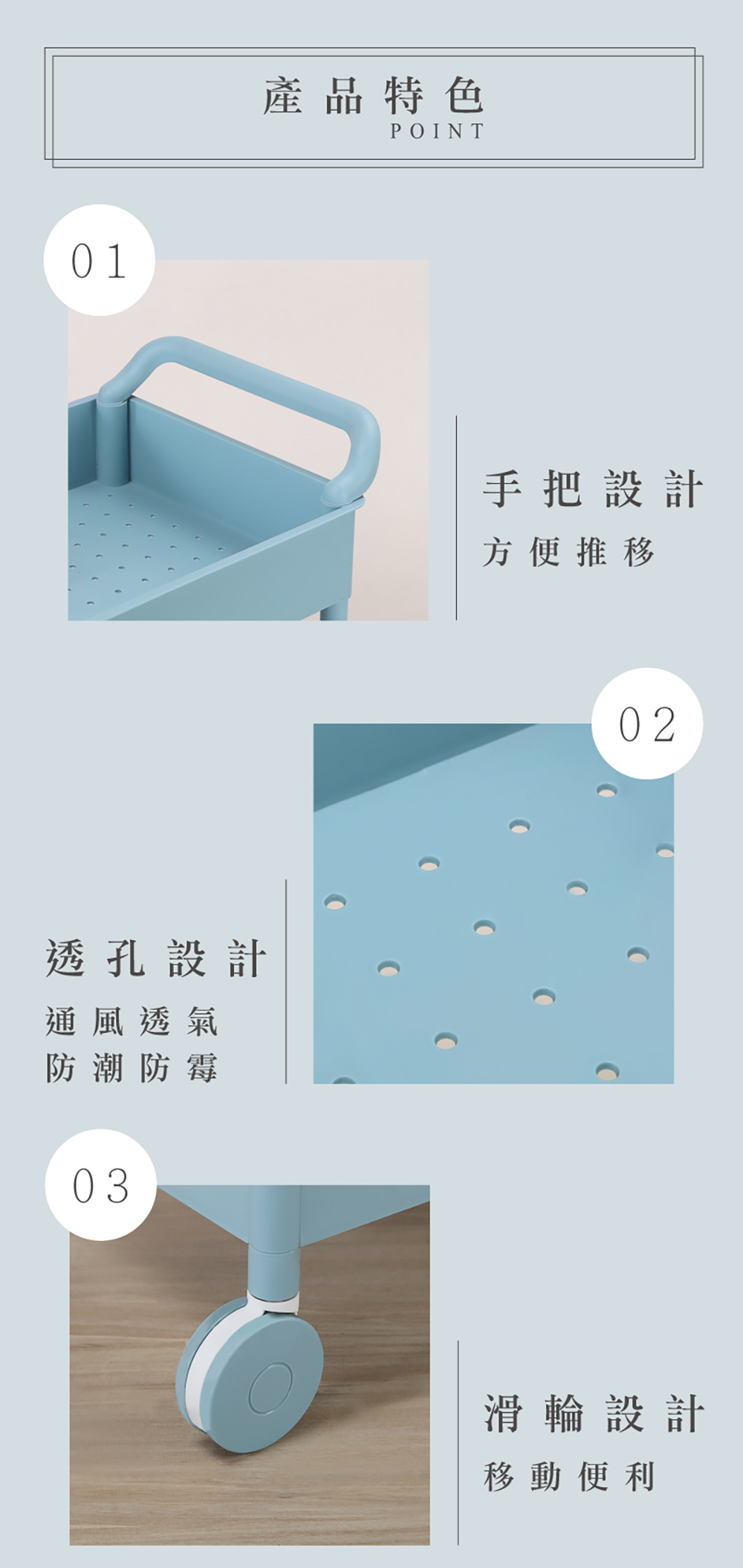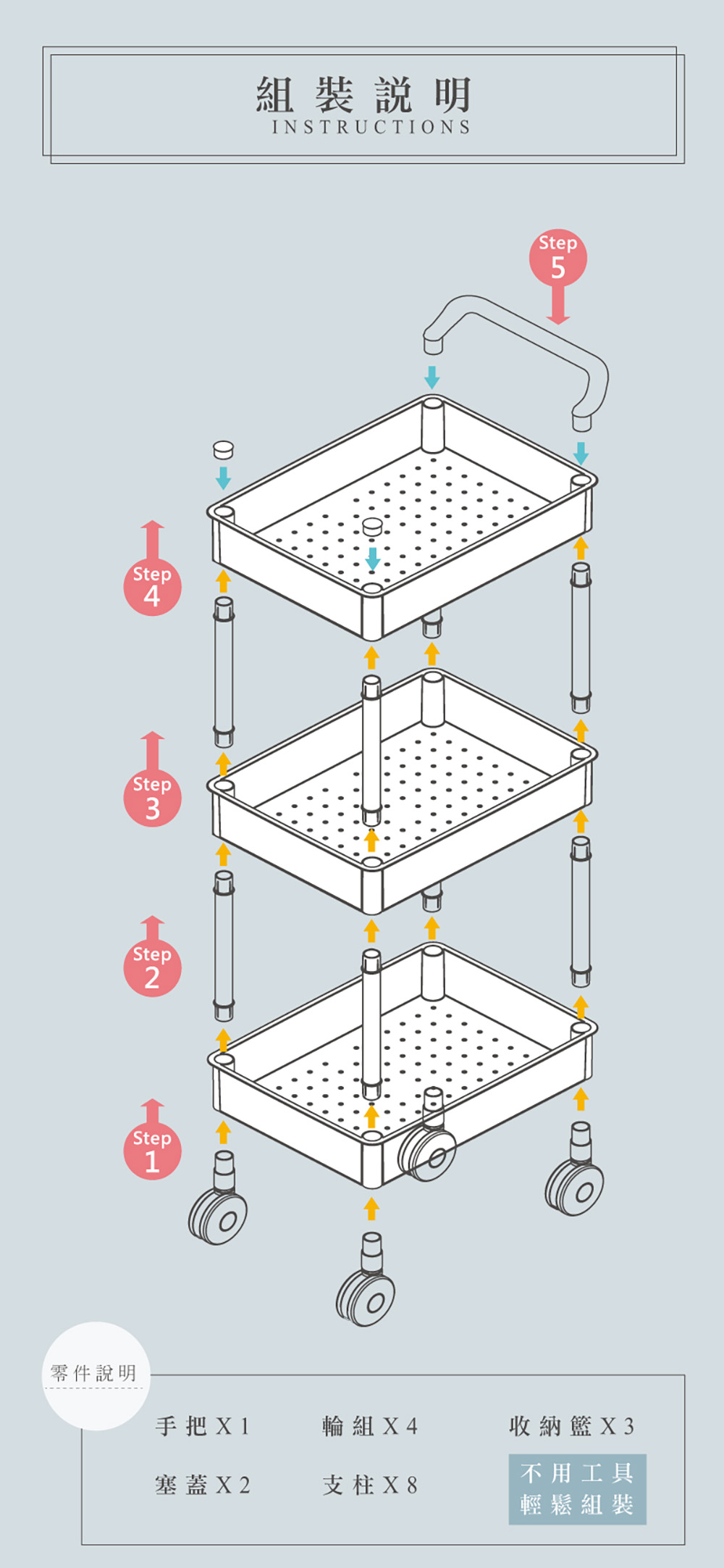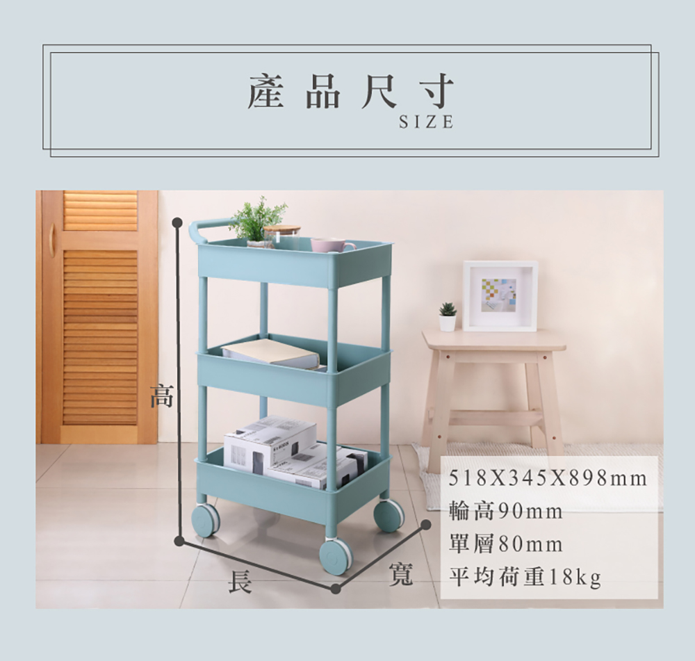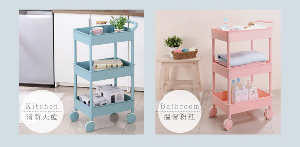 - 使用方法:簡易組裝,輕鬆DIY,繽紛嫩彩色系,滑輪設計,移動便利,手把設計,方便推移,架面作小孔設計。