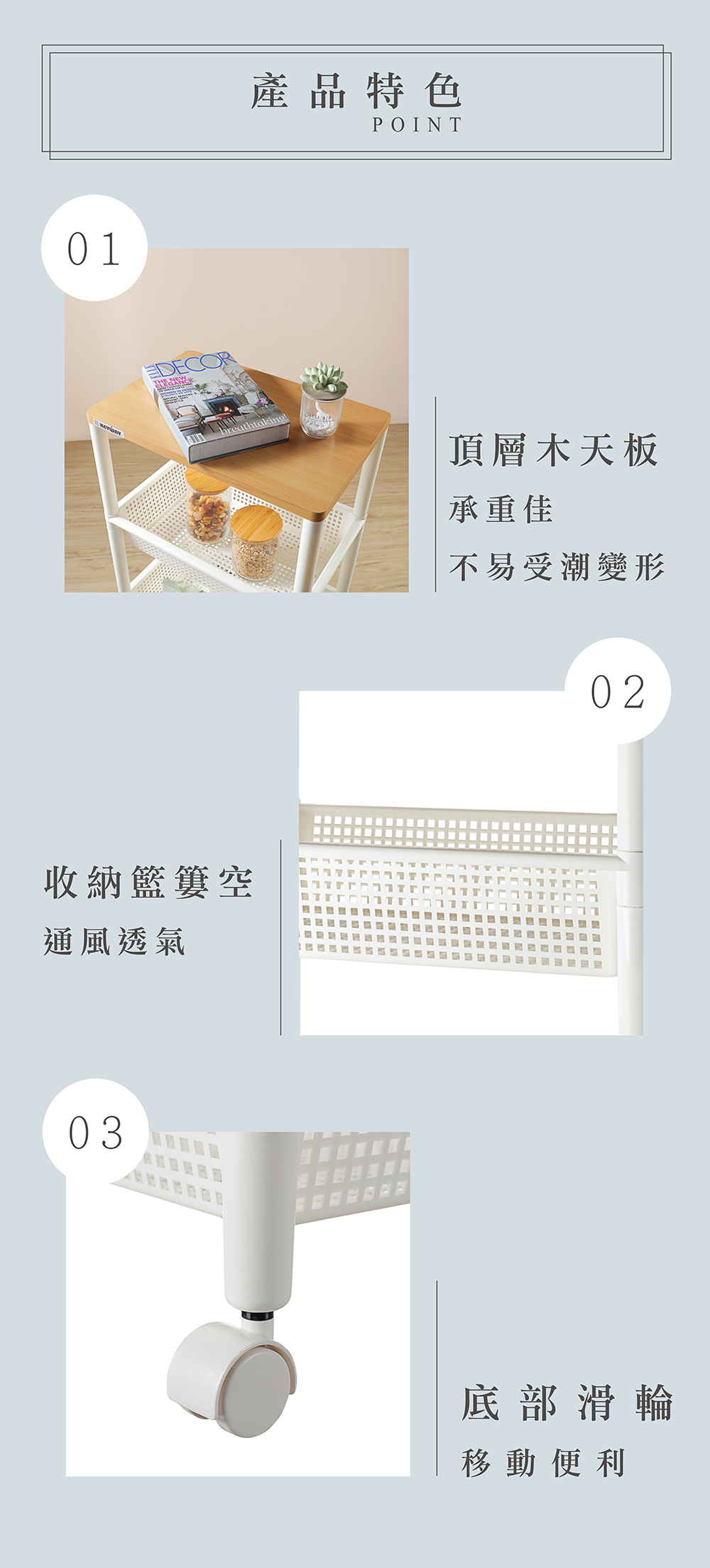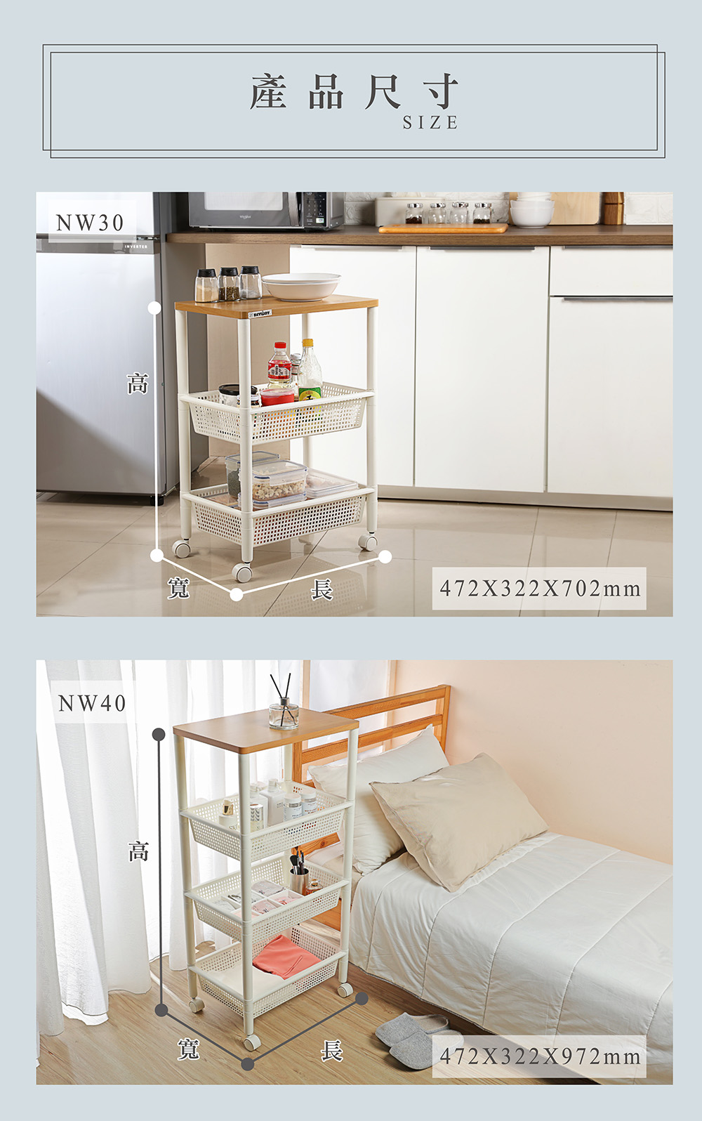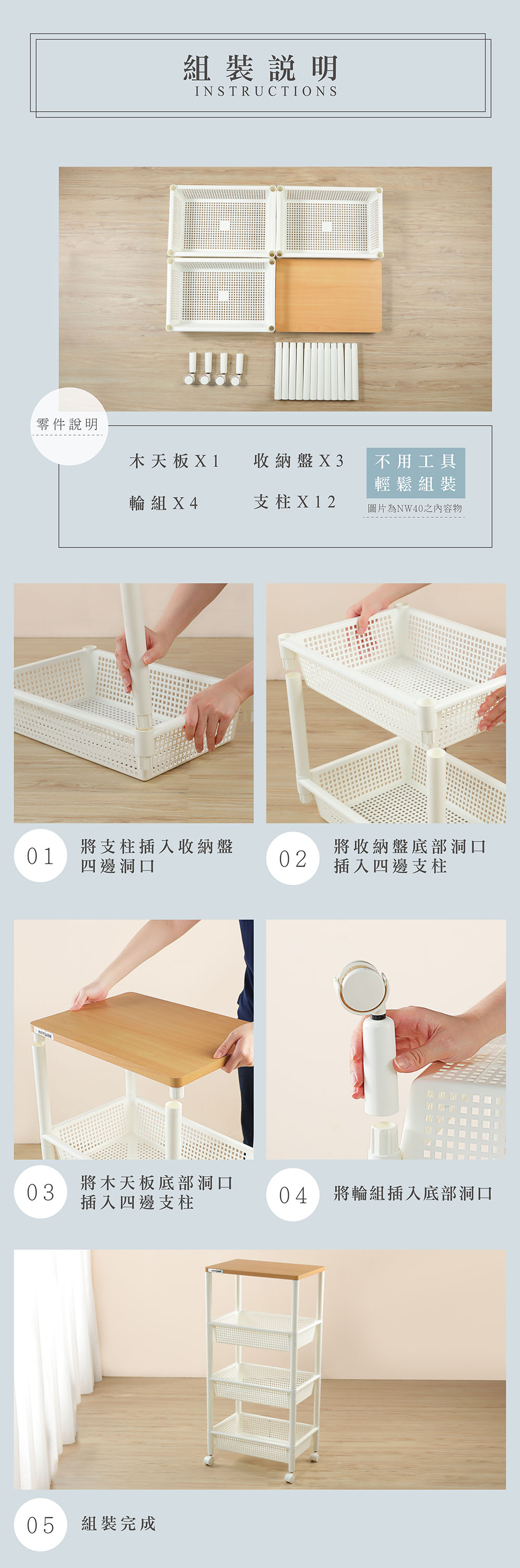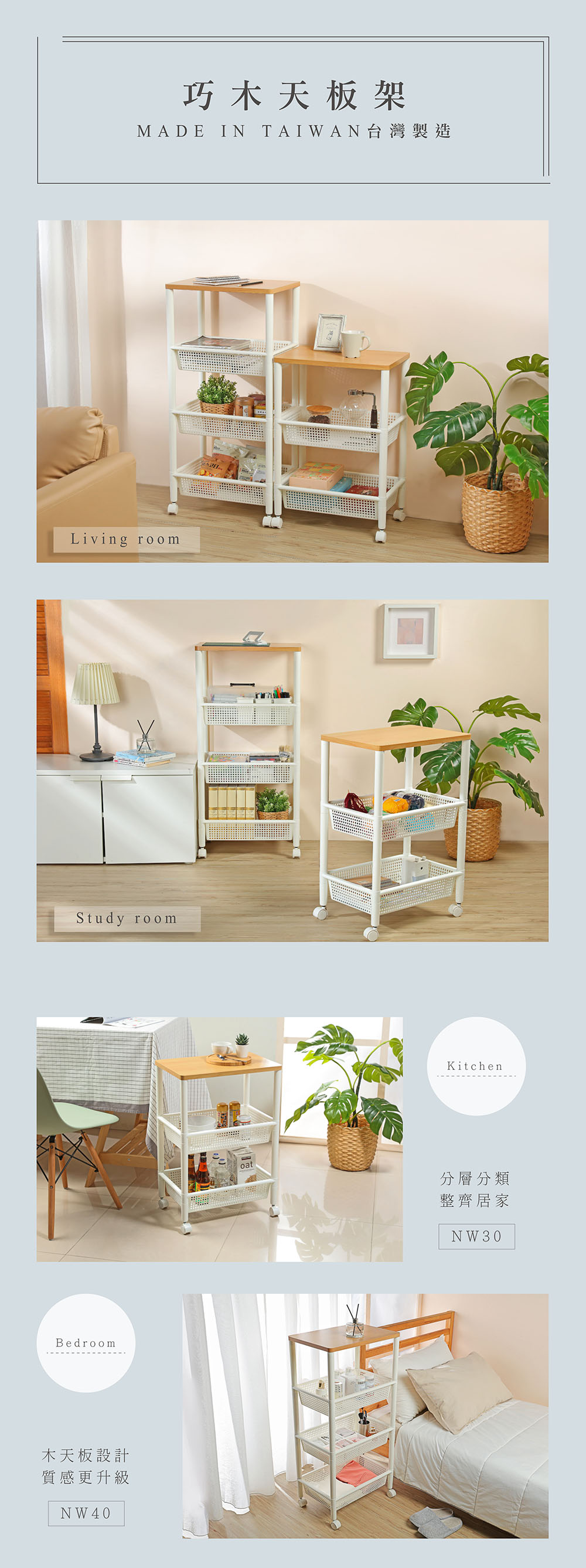 - 使用方法:頂層作創新木天板設計,更能承重,不易受潮變形,滑輪設計,移動便利,自由組裝,輕鬆上手;淨白透亮色調搭配木質天板,更富質感,適用於居家、辦公室等各式空間,有三層(NW30)、四層(NW40)之樣式,可供選擇。