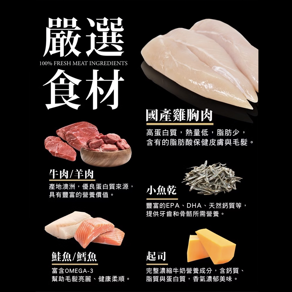 國產雞胸肉、小魚干、澱粉、蔬菜甘油、維他命E(抗氧化劑)、綜合維生素