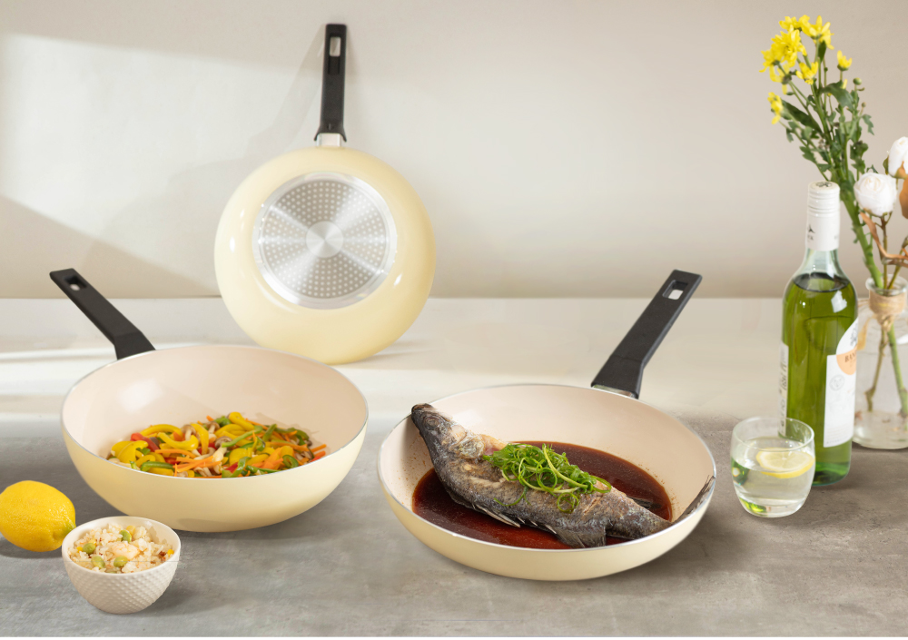 雙重陶瓷不沾塗層,硬度高,耐磨耐用內層特殊霧面處理,深色食物不染色 質感色系,為廚房帶來最療癒的春日氣息
