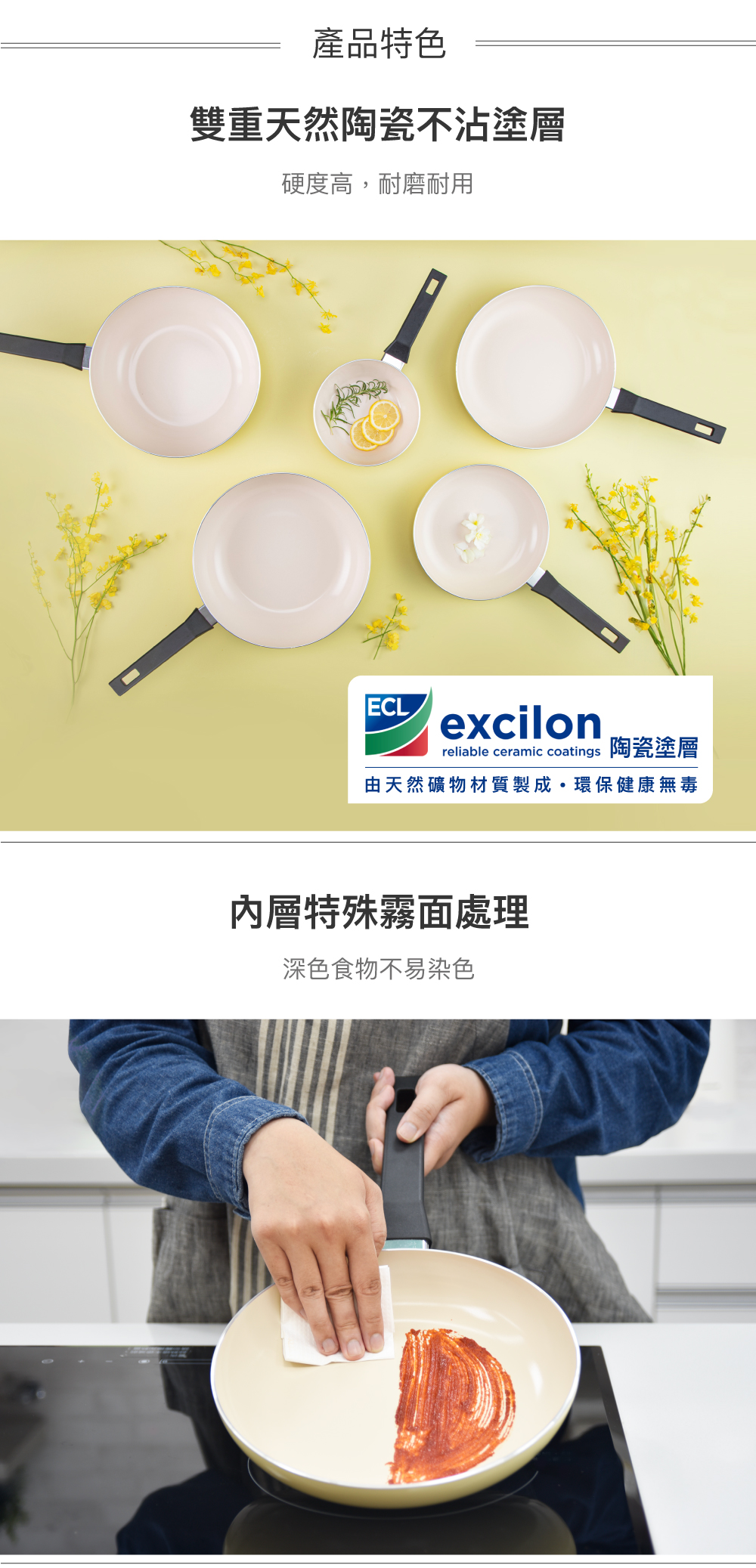雙重陶瓷不沾塗層,硬度高,耐磨耐用內層特殊霧面處理,深色食物不染色
