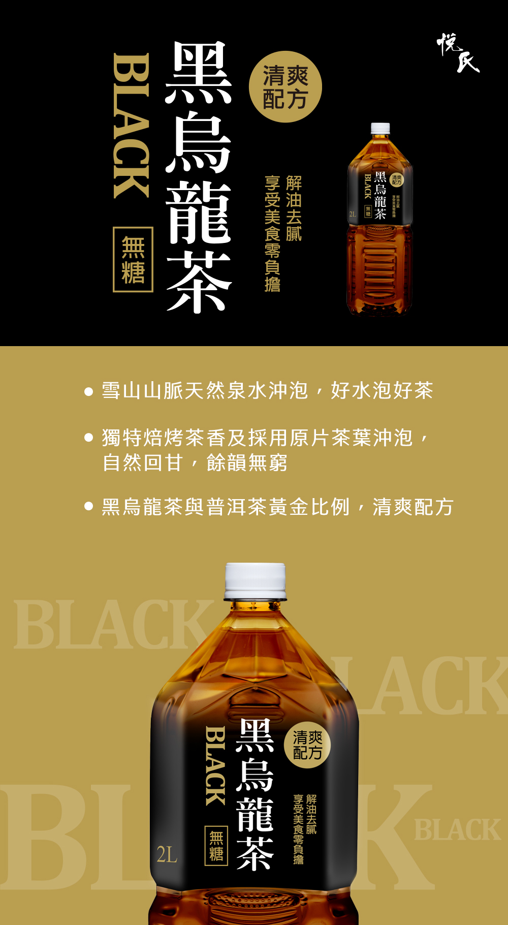 .雪山山脈天然泉水沖泡,好水泡好茶 .獨特焙烤茶香及採用原片茶葉沖泡,自然回甘,餘韻無窮 .黑烏龍茶與普洱茶黃金比例,清爽配方全新口感